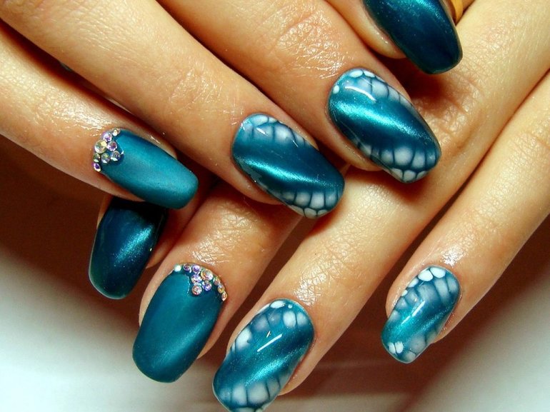 - Кошачий глаз. Новомодная техника великолепно смотрится не только на темных глубоких оттенках, но и на насыщенной бирюзе, особенно если выбирать морские ее тона. А чтобы получить тот самый фирменный блик, достаточно просто воспользоваться специальным магнитом непосредственно в процессе моделирования.
