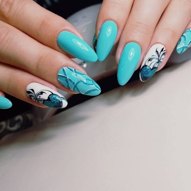 Элегантный бирюзовый цвет несмотря на сложность, хорошо сочетается с самыми разными оттенками. К примеру, вместе с белым цветом они часто составляют основу для классического нейл-арта. Это френч, свадебный дизайн, а также различные рисунки в геометрическом стиле. Благодаря такому оформлению маникюр в любом случае будет выглядеть нежно и идеально дополнит большинство образов, независимо от сезона.
