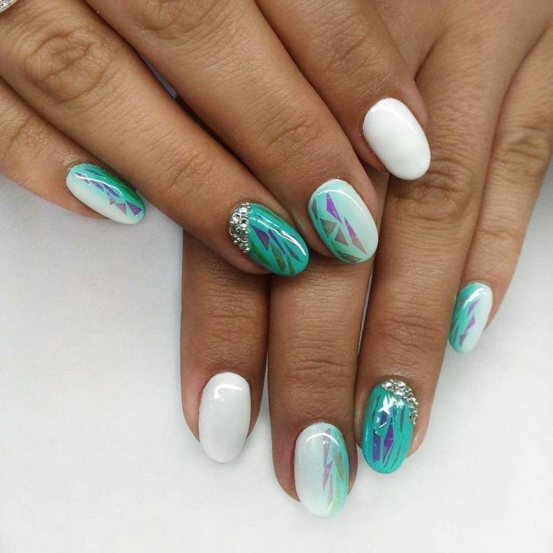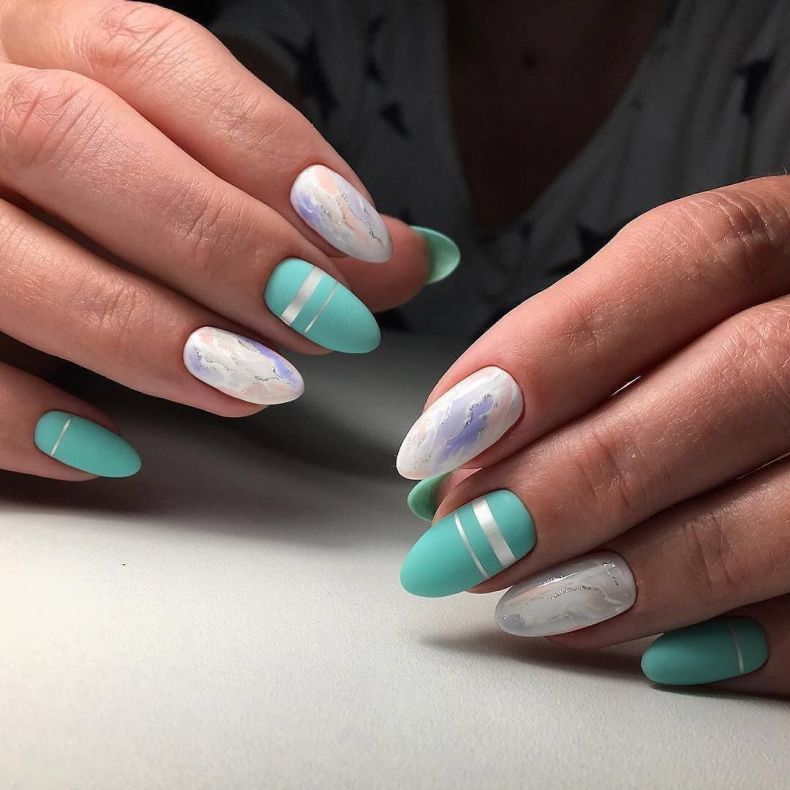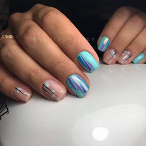 Вкусы у всех разные, если настроение сделать не френч или nude, то смело выбирайте сочетание двух зеленых оттенков с минимумом дизайна. А также любителям минимализма могут понравиться тонкие полоски пастельных и бирюзовых тонов на прозрачной основе — получится по-летнему привлекательный маникюр. А короткие ногти в бирюзовых тонах дополнительно можно украсить блестками, выделив один ноготь.