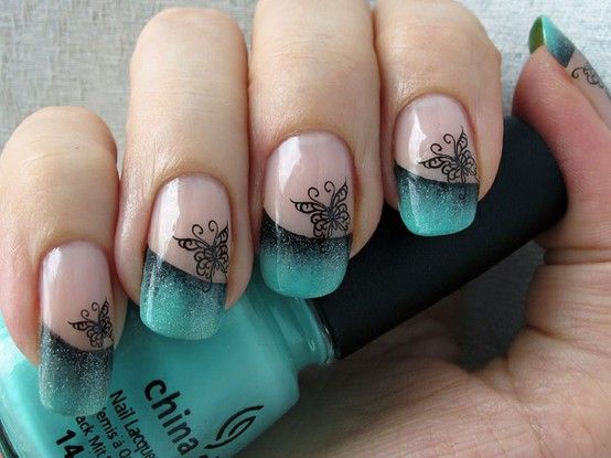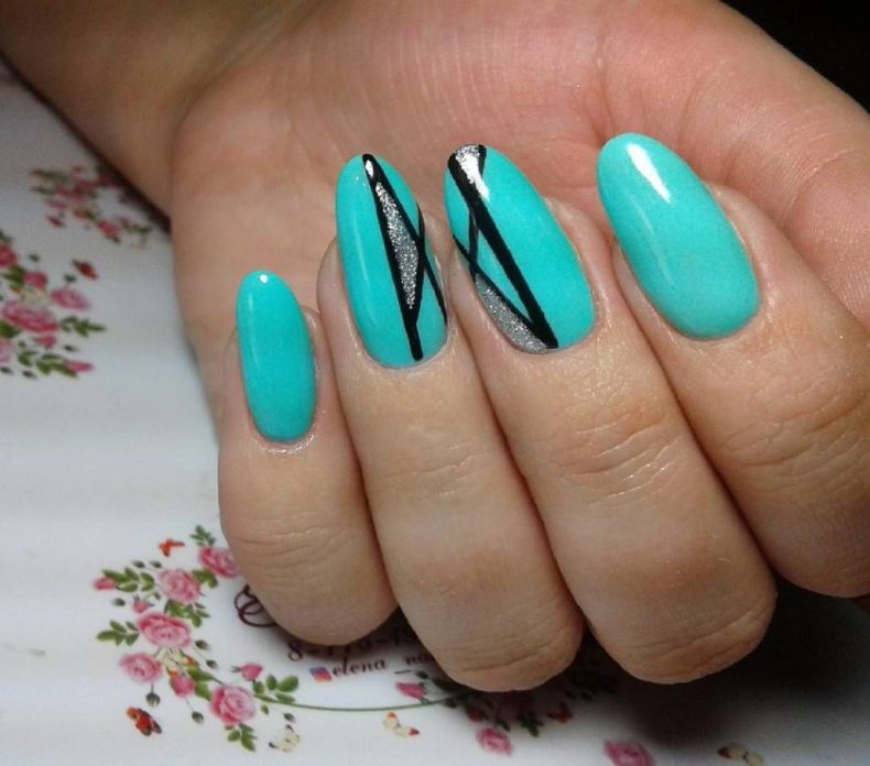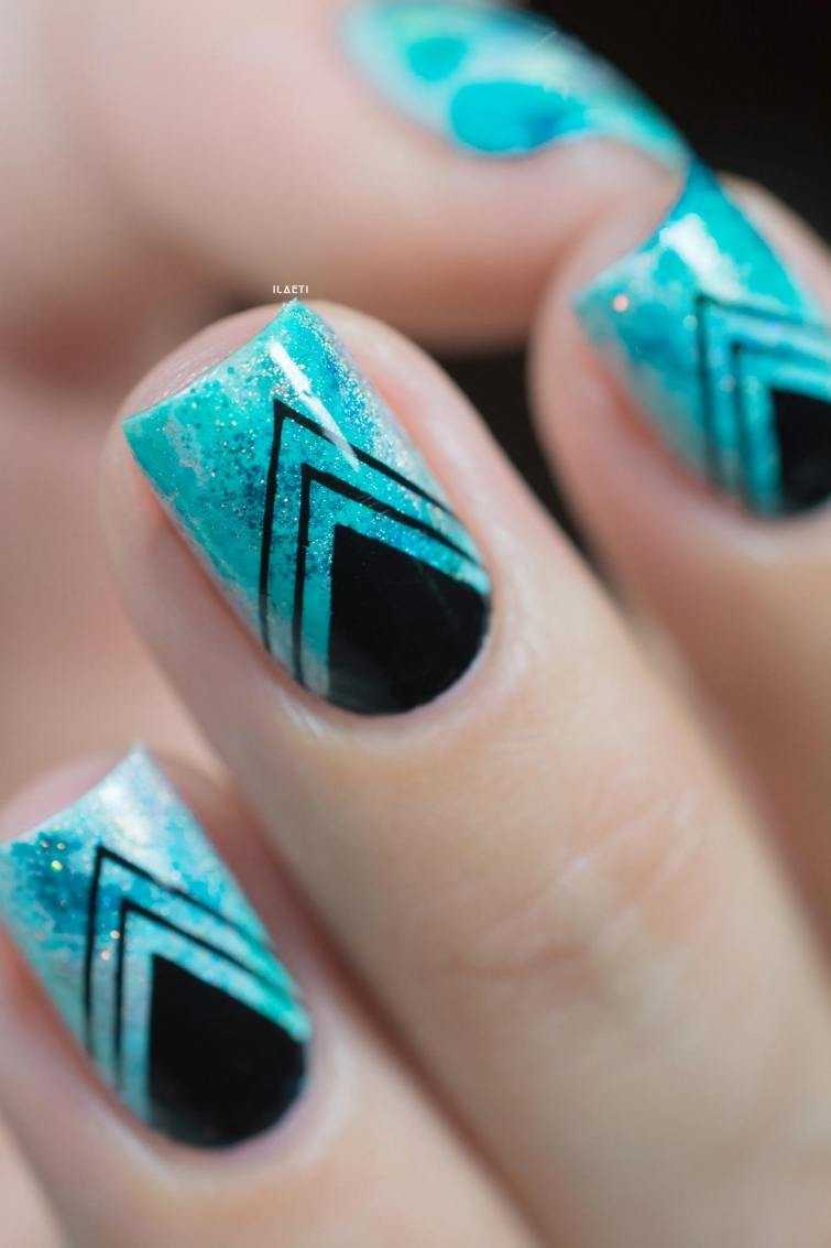 Идей черно-бирюзового маникюра огромное количество. Это могут быть аккуратные полоски черным цветом на бирюзовом фоне, отпечатка бирюзовой фольгой на черном фоне, рисунки-оригами в черном цвете на бирюзовом ноготке.