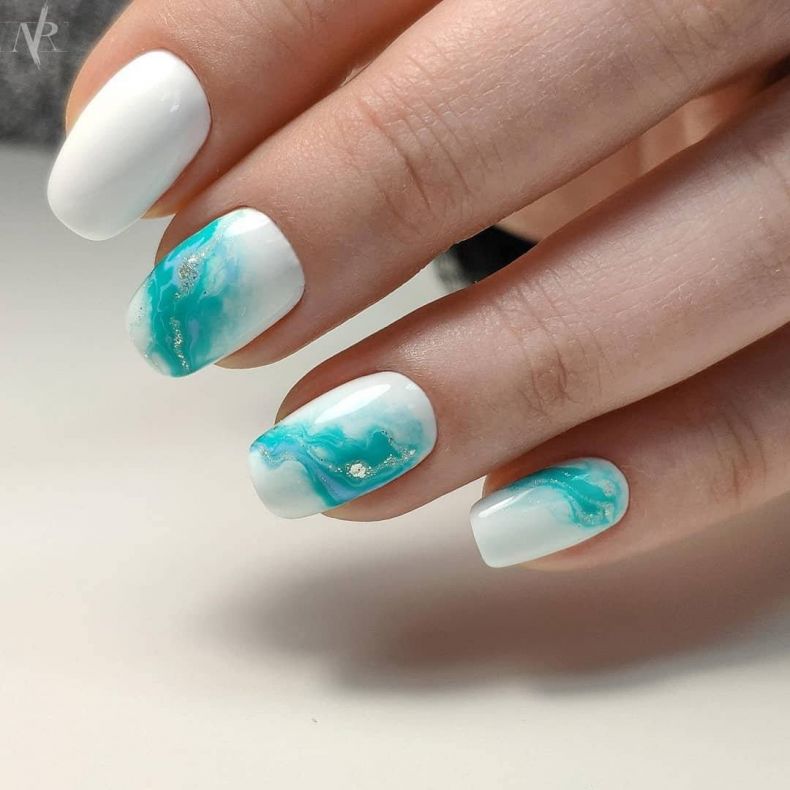 Бирюзовый маникюр с белым лаком можно сделать в интересной водной технике. Несколько капель белого лака помещается в тару с водой, размешивается зубочисткой, а затем на водную поверхность лаком распыляется лак для волос или любой спрей. От этого действия лак свернется, и, если окунуть в воду ногти, этот узор перенесется на ногтевую пластину и приобретет вид морской пены.