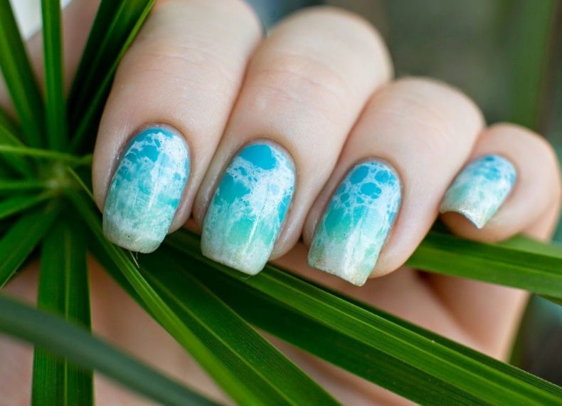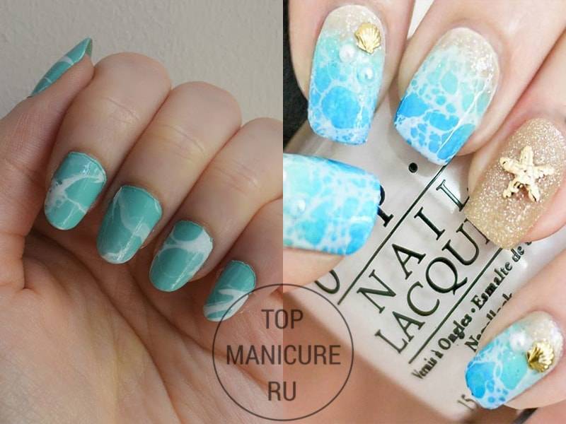 Имитация воды. Первое с чем ассоциируется бирюзовый цвет – это морские волны и пена. Почему бы не изобразить их на ногтях?