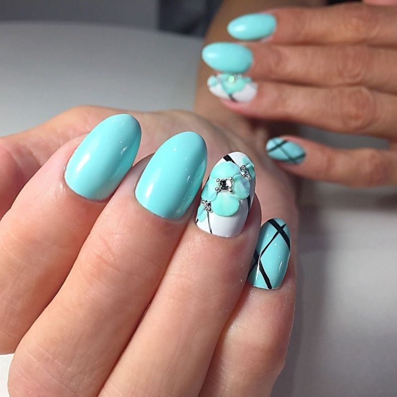 При выборе маникюра важно, чтобы он не выделялся от всего образа. Если выбранный наряд в бирюзовом цвете, то и маникюр должен иметь соответствующий оттенок.