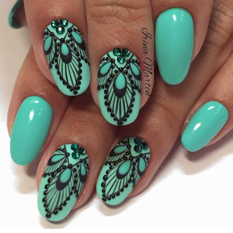 Особенно интересно выглядит кружевное оформление в черно-бирюзовом цвете. При этом можно использовать любой цвет в качестве прорисовки узора. Дополните такой дизайн черными мелкими стразами для окантовки узора, используйте вместо кружева узоры мехенди. Такой дизайн существенно отличается от классических пастельных нейл-артов, в большей степени благодаря контрастности и оригинальности узора.