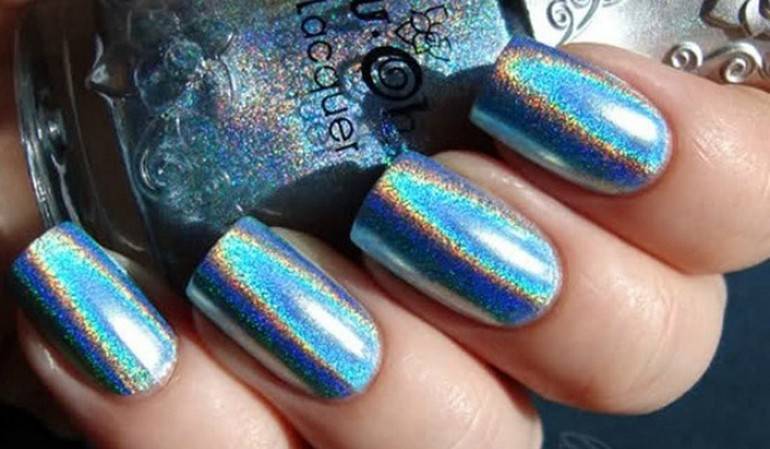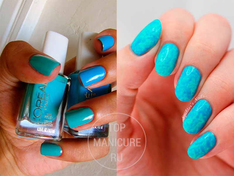 Фото 2. Чтобы создать такой голубо-бирюзовый маникюр, используется интересная техника. Ногти покрываются лаком бирюзового оттенка в один слой. Сверху наносится голубой лак. Пока он не высох, нужно взять смятый полиэтиленовый кусочек и пройтись по ногтям, как бы смешивая лак. После этого маникюр покрывается прозрачным лаком для выравнивания и придания блеска.