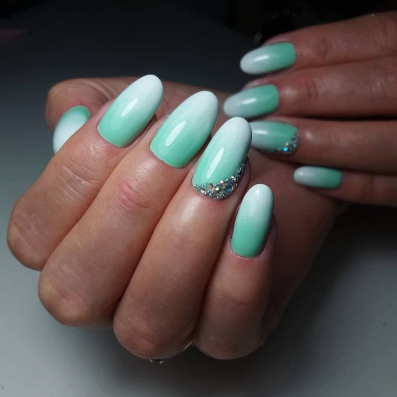 На бирюзовом дизайне ногтей тонкие серебряные линии выглядят аристократично и сдержанно. Один или два безымянных пальцах можно украсить великолепным омбре с эффектом градиента — плавного перехода.