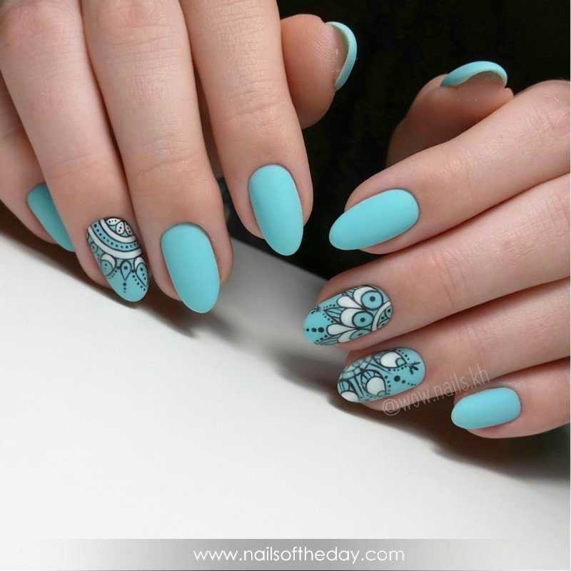- Особенно эффектно смотрятся белые индийские узоры. Но и традиционная роспись в виде прозрачного кружева делает маникюр в бирюзовых тонах еще утончённее и свежее.