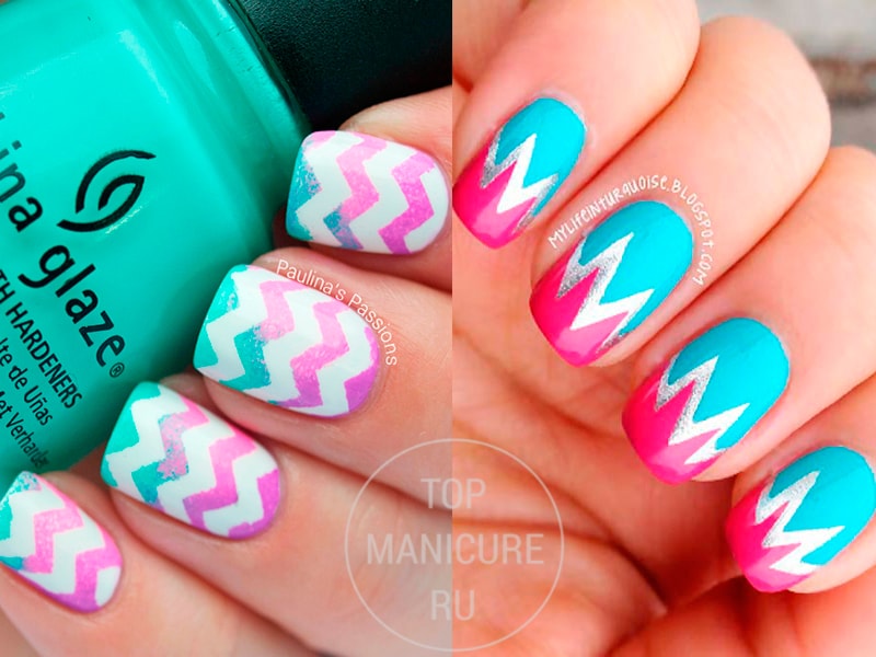 Очень красивое сочетание это розово-бирюзовый маникюр. В данном случае он украшен зигзагами, которые создаются с использование трафарета. На фото 1 сначала ногти красятся в белый цвет, затем на них клеятся зигзагообразные кусочки липкой ленты. Розовый и бирюзовый лак нужно нанести на губку, а потом промакнуть ею ногти. Ленты-зигзаги убираются. Во втором случае также задействованы трафареты. Этот дизайн делается в три слоя: сначала бирюзовые ногти, затем серебристый френч зигзагом и только потом розовый френч-зигзаг.