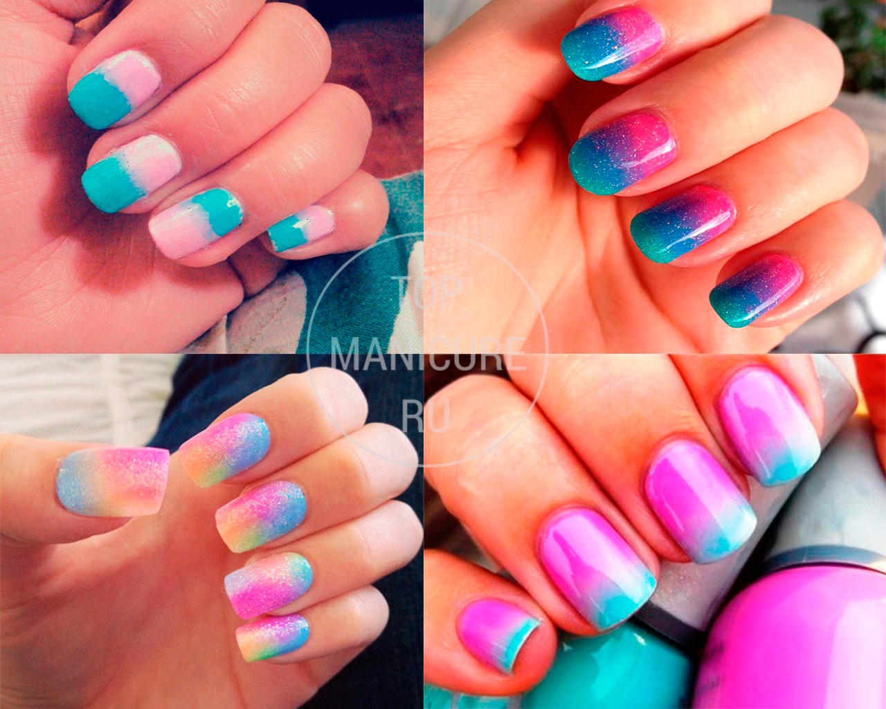 Очень красиво смотрится бирюзовый маникюр с розовым лаком в технике градиент, о которой мы говорили ранее. Такой дизайн можно смело украсить сияющими блестками.