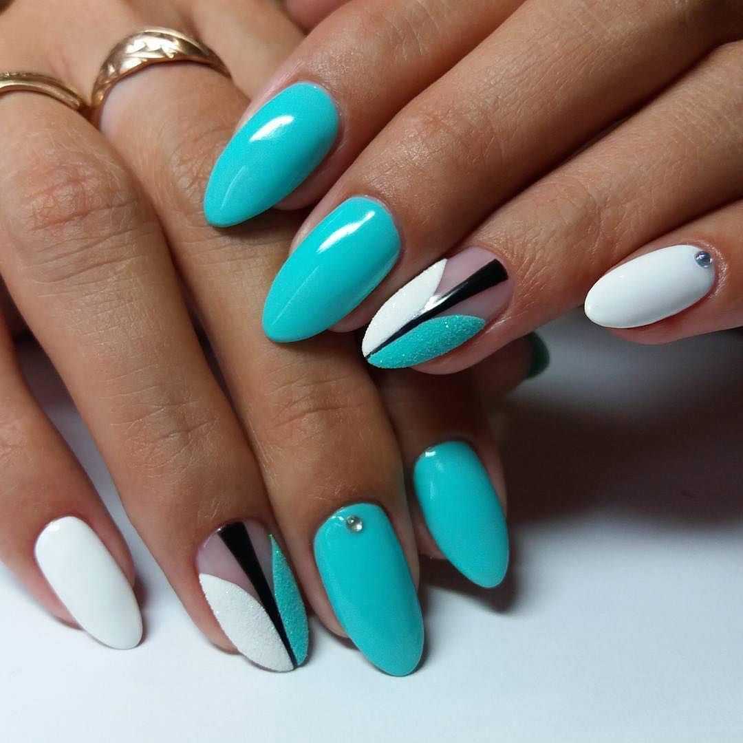 Бирюзовые оттенки гель-лака смотрятся намного интереснее с топом, имитирующим принт в стиле «перепелиное яйцо» — тренд. Черные или белые хлопья на матовом бирюзовом однотонном покрытии — самый быстрый и модный способ оформления ногтей в этом году. Этот декоративный топ или гель прекрасно дополнит дизайн «разные руки», геометрический принт, молочный градиент, маникюр с использованием росписи, слайдера, стемпинга, акварели. Выбор нейл-идей и стилей — широк.