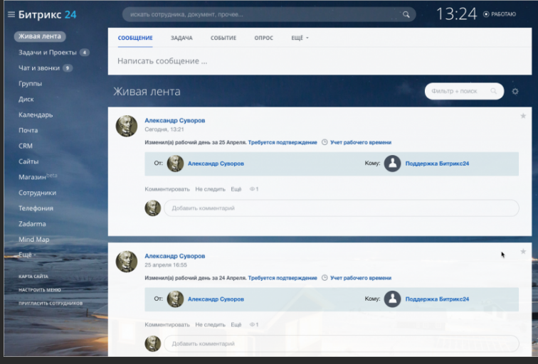 Еще одним важным инструментом внутрикорпоративной коммуникации в Битрикс 24 является Живая лента, в которой можно не только обсуждать рабочие вопросы, но и согласовывать документы, публиковать приказы, ставить задачи и др.