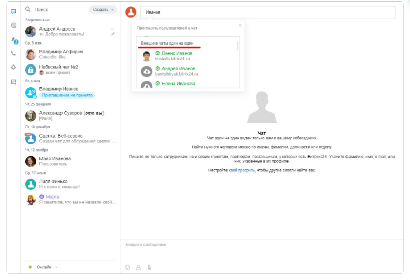Битрикс 24 предоставляет компании широкий выбор каналов коммуникации и с клиентами, и между сотрудниками внутри организации. Интересным инструментом внутреннего взаимодействия являются чаты между сотрудниками — внутренний мессенджер, функционал которого позволяет создавать задачи, назначать встречи из диалога и передавать файлы. Чат можно использовать для внутрикорпоративного общения или, при необходимости, пригласить в него клиента или партнера.