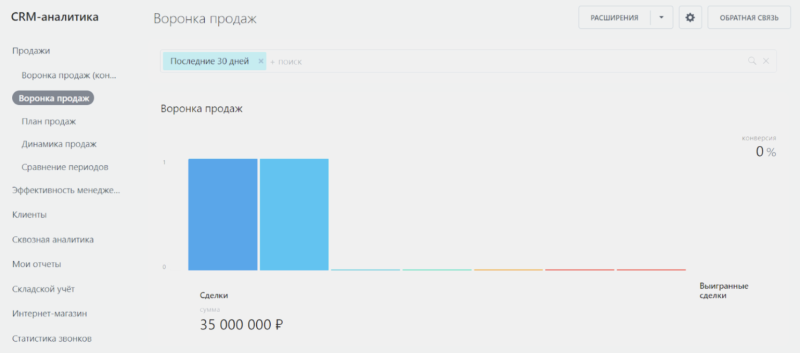 Продажи. Здесь можно посмотреть воронку продаж, план продаж, динамику и сравнить данные по периодам. Например, сравнить оборот в январе прошлого года с оборотом в январе текущего.