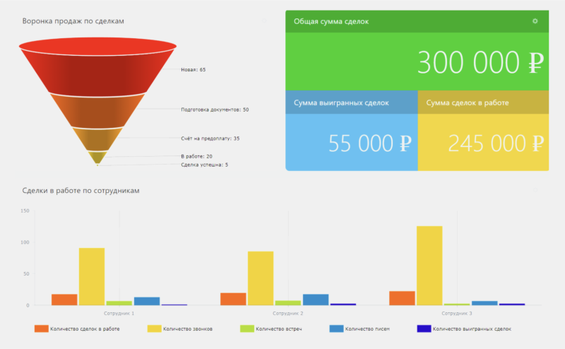 Ещё во вкладке «Продажи» можно увидеть конверсию в продажи и показатели работы менеджеров. Например, сколько запланировано сделок, сколько обрабатывается сейчас и сколько закрыто.