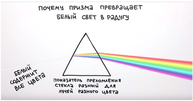 Почему же призма превращает белый свет в радугу? Оказывается, дело в том, что все цвета радуги уже содержатся в белом свете. Показатель преломления стекла различается для лучей разного цвета. Поэтому призма отклоняет эти лучи по-разному.