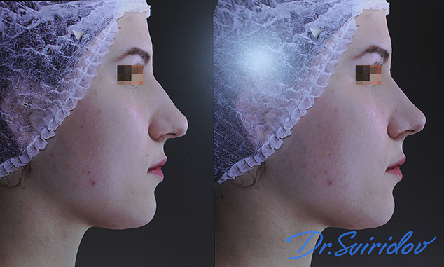 Ринопластика. У данной пациентки травматическая деформация кончика носа и искривление носовой перегородки с неярко выраженным нарушением функции носового дыхания. В ходе закрытой (внутренний доступ) риносептопластики выполнена коррекция искривления перегородки (лор-хирург), и восстановлена правильная форма кончика носа, его «укрепление» и поднятие с использованием хрящевого аутотрансплантата, уменьшением ширины спинки носа. В области верхней губы произведена лазерная селективная (избирательная) коагуляция сосудистой дисплазии кожи через 3 недели после риносептопластики.