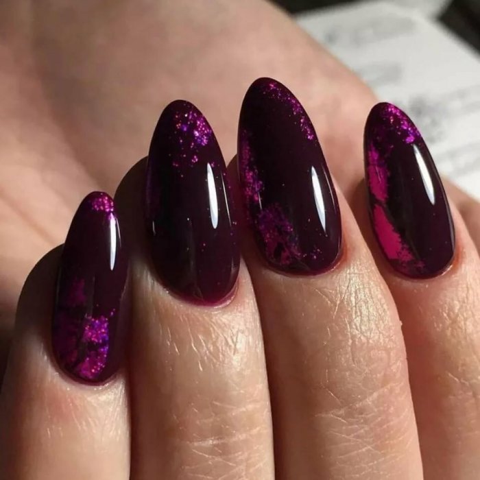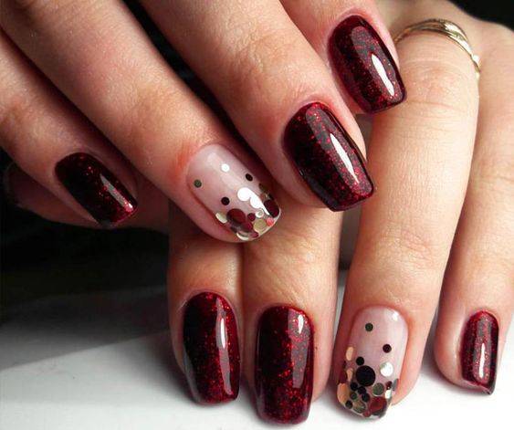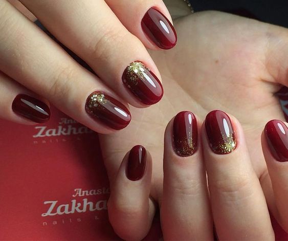 Блестки, находящиеся в составе лака, могут быть либо крупными, либо в виде пылинок. Золотом можно окрасить только один ноготь, а остальные оставить в бордовом цвете.