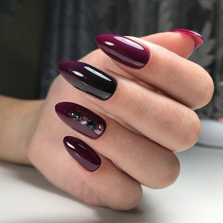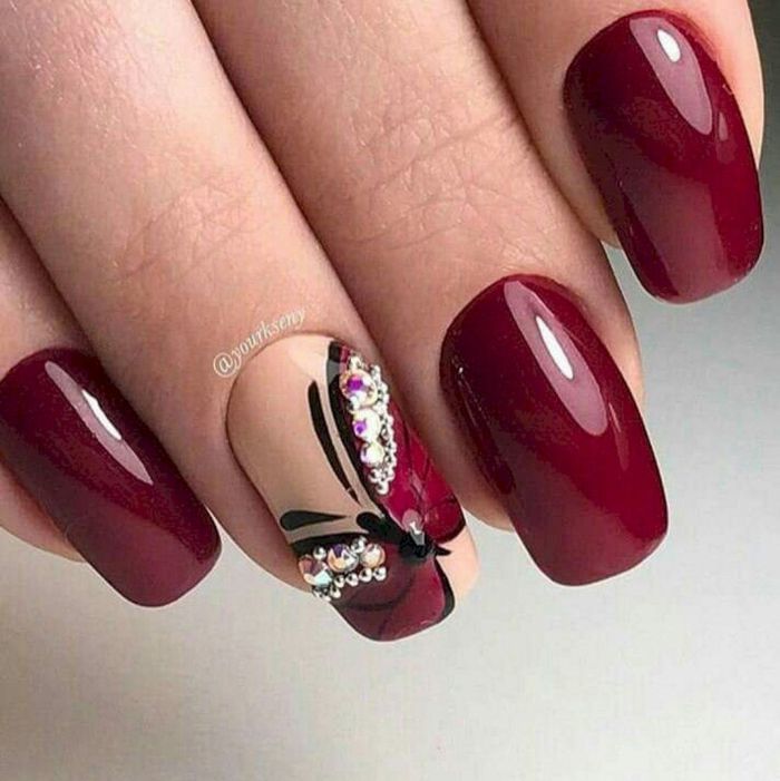 Бордовый маникюр со стразами всегда в тренде. Идей, как использовать разноцветные и блестящие камешки на бордовых ногтях, очень много:
