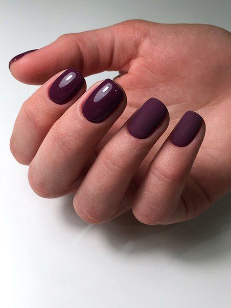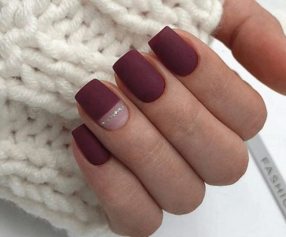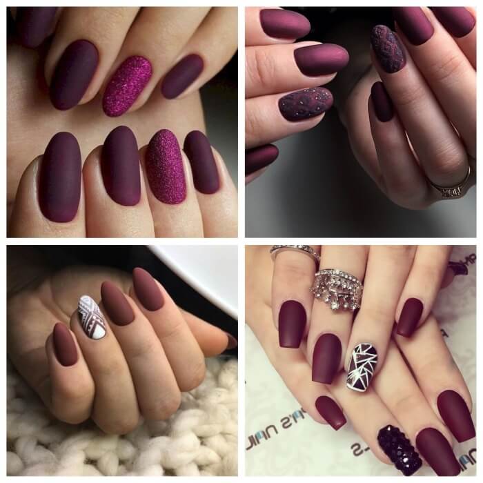 - Бордово-матовый маникюр. Однотонное или комбинированное покрытие будет смотреться еще более эффектно и интригующе с матовым, добавляющим нежности и бархатистости в облик.