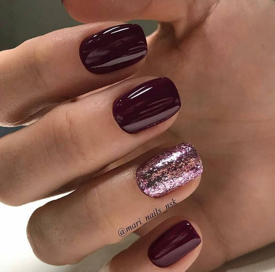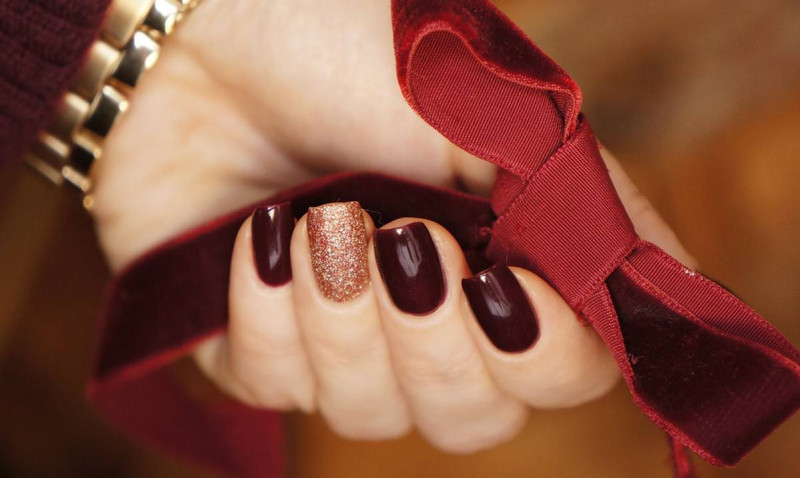 - Сделать на одном пальчике сияющее покрытие. Остальные покрасить спокойным бордовым оттенком.