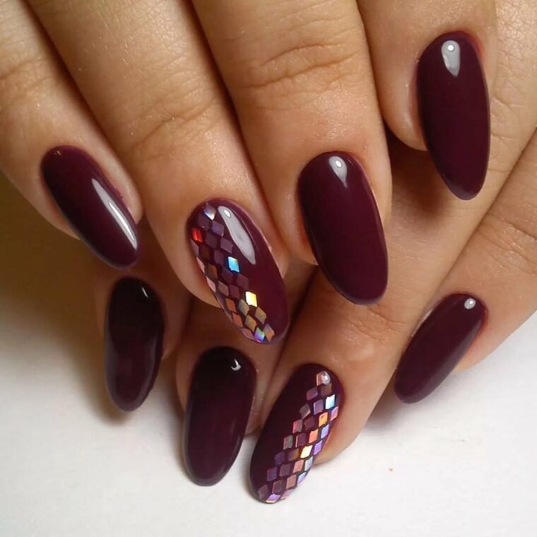 Бордовый маникюр со стразами и блестками