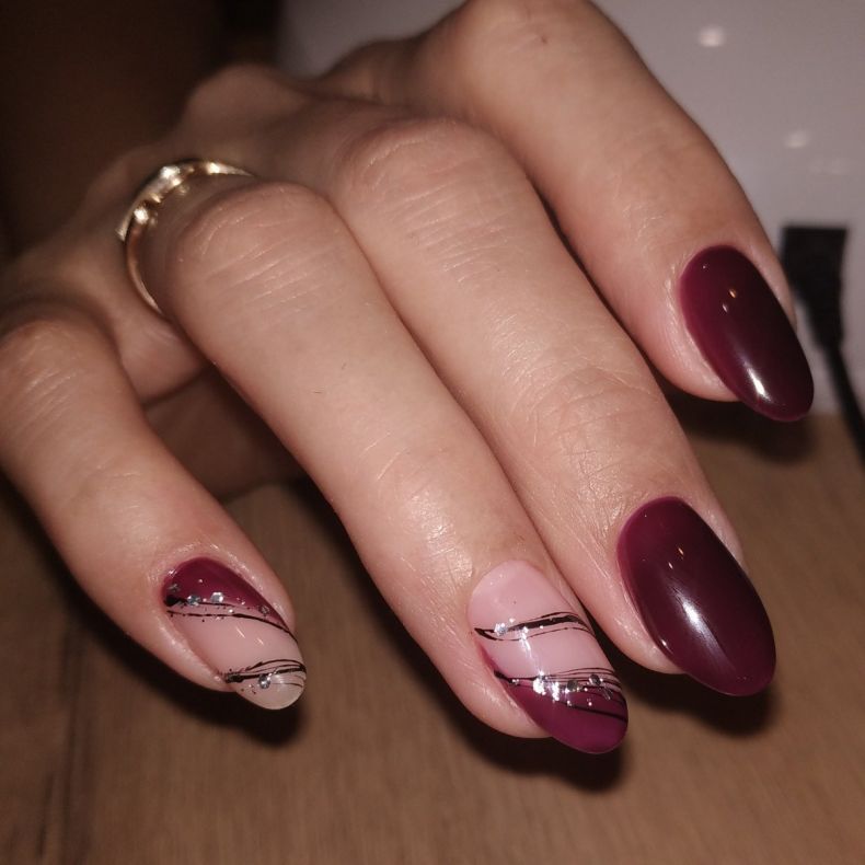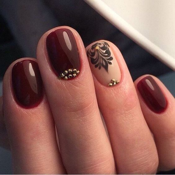 Широкий цветовой диапазон позволяет экспериментировать и с оттенками камешков. Для выкладки узоров на покрытии колера бордо отлично подойдут прозрачные, золотые, серебряные, белые, чёрные стразы. А для декора винного маникюра с негативным пространством или комбинированного с более мягкими оттенками, можно использовать камешки бордового цвета.