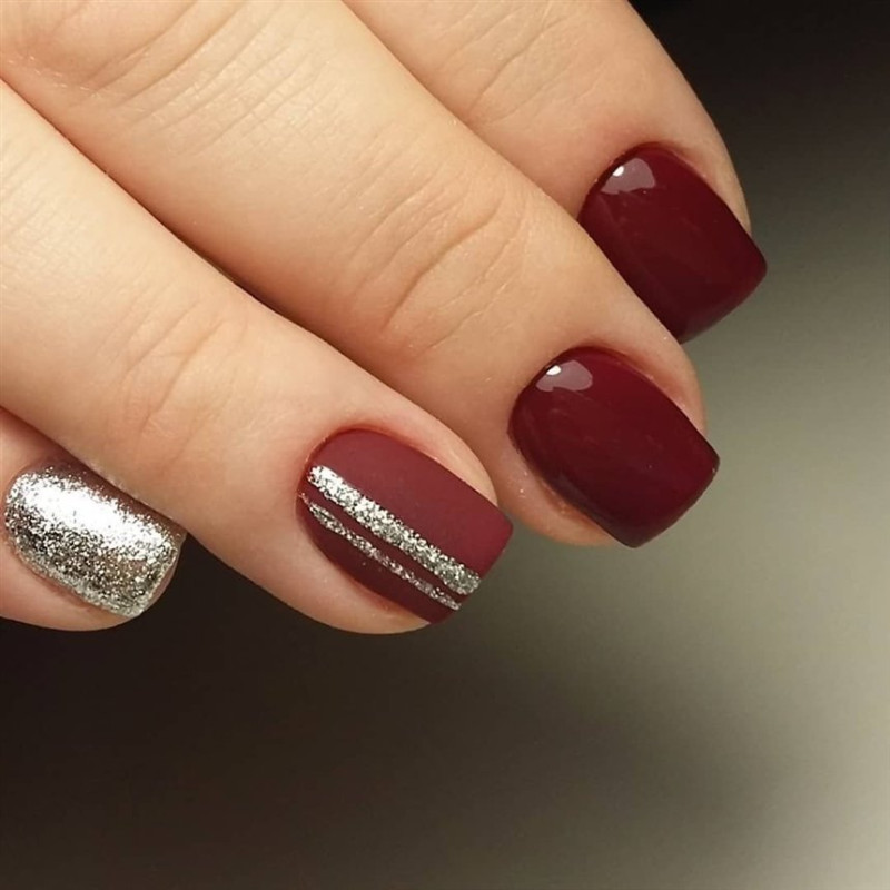 Сезонный. В зависимости от времени года, можно использовать либо теплые, либо холодные оттенки темно-красного. К примеру, глубокий однотонный красный в сочетании с винным станет отличным вариантом для осеннего маникюра. Эту идею можно дополнить, разбавив однотонность золотыми блестками.