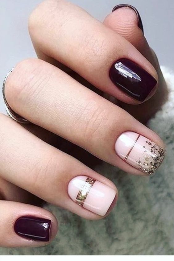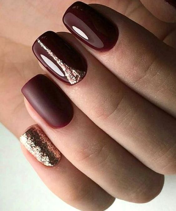 Дизайн ногтей в бордово-золотистых тонах.