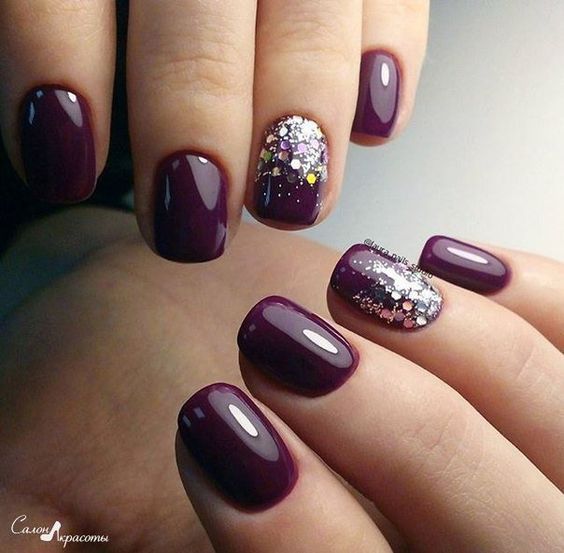 Шикарно смотрятся классические бордовые дизайны (френч или лунный маникюр) дополненные глиттером или стразами. Винный маникюр с ноткой таинственности, выполненный в технике омбре с помощью блесток, входит в список самых трендовых оформлений.