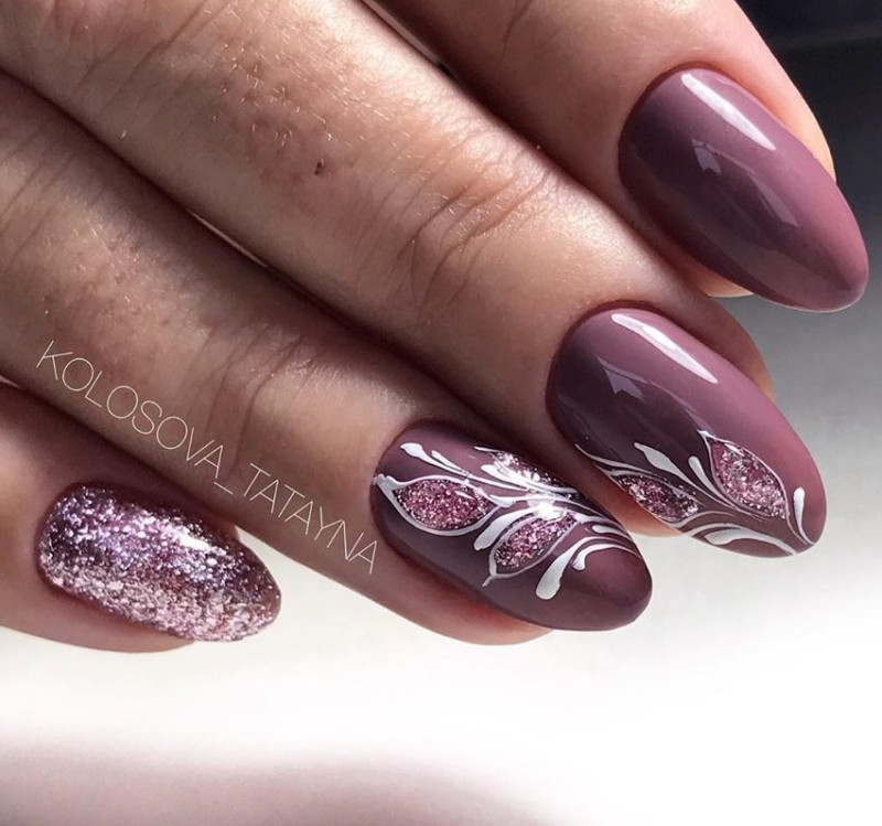 С рисунками. Покрыть росписью можно все ногти, а можно выборочные. Маникюр будет выглядеть лаконично, если расписать безымянный и средний пальцы. Узоры, выполненные кистью, смотрятся эффектнее всего.