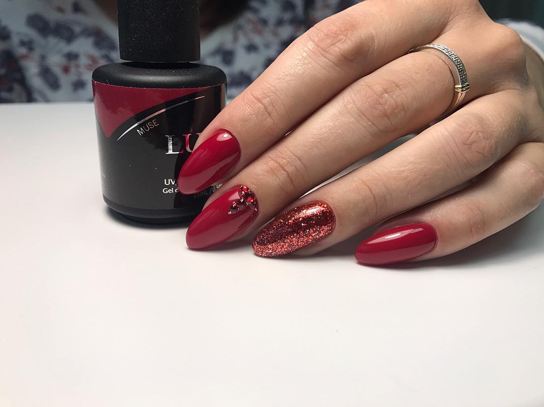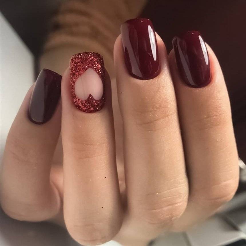 Сезонный. В зависимости от времени года, можно использовать либо теплые, либо холодные оттенки темно-красного. К примеру, глубокий однотонный красный в сочетании с винным станет отличным вариантом для осеннего маникюра. Эту идею можно дополнить, разбавив однотонность золотыми блестками.