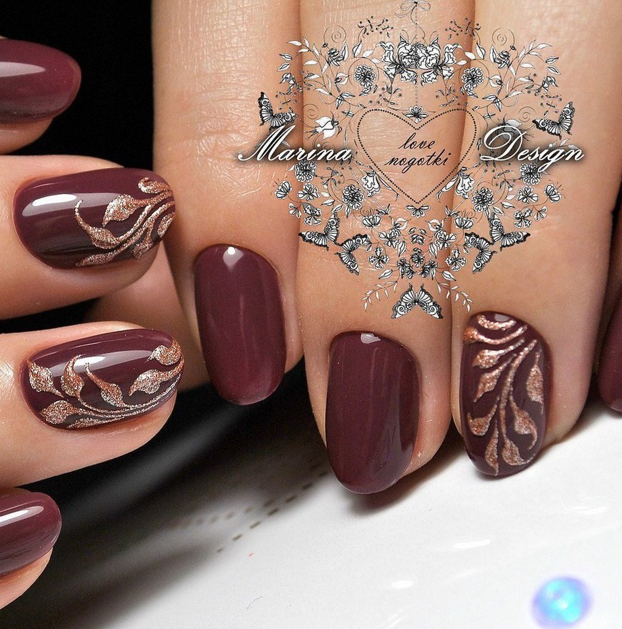 Дизайн ногтей в бордово-золотистых тонах.