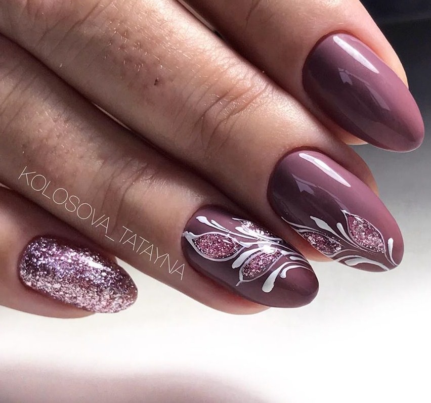 С рисунками. Покрыть росписью можно все ногти, а можно выборочные. Маникюр будет выглядеть лаконично, если расписать безымянный и средний пальцы. Узоры, выполненные кистью, смотрятся эффектнее всего.