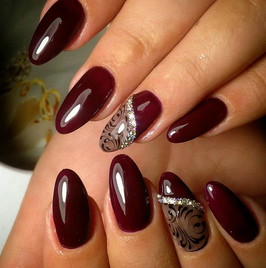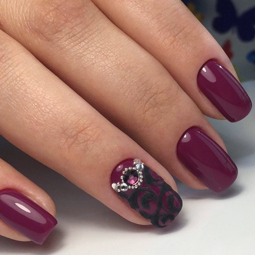 Бордовый маникюр со стразами всегда в тренде. Идей, как использовать разноцветные и блестящие камешки на бордовых ногтях, очень много: