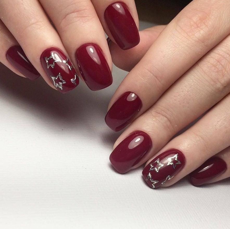 Различаются камешки и по материалу изготовления: пластмасса, либо стекло. С бордовым оттенком лучше комбинировать стеклянные стразы, которые дополнят маникюр волшебными переливами и чарующим сиянием.