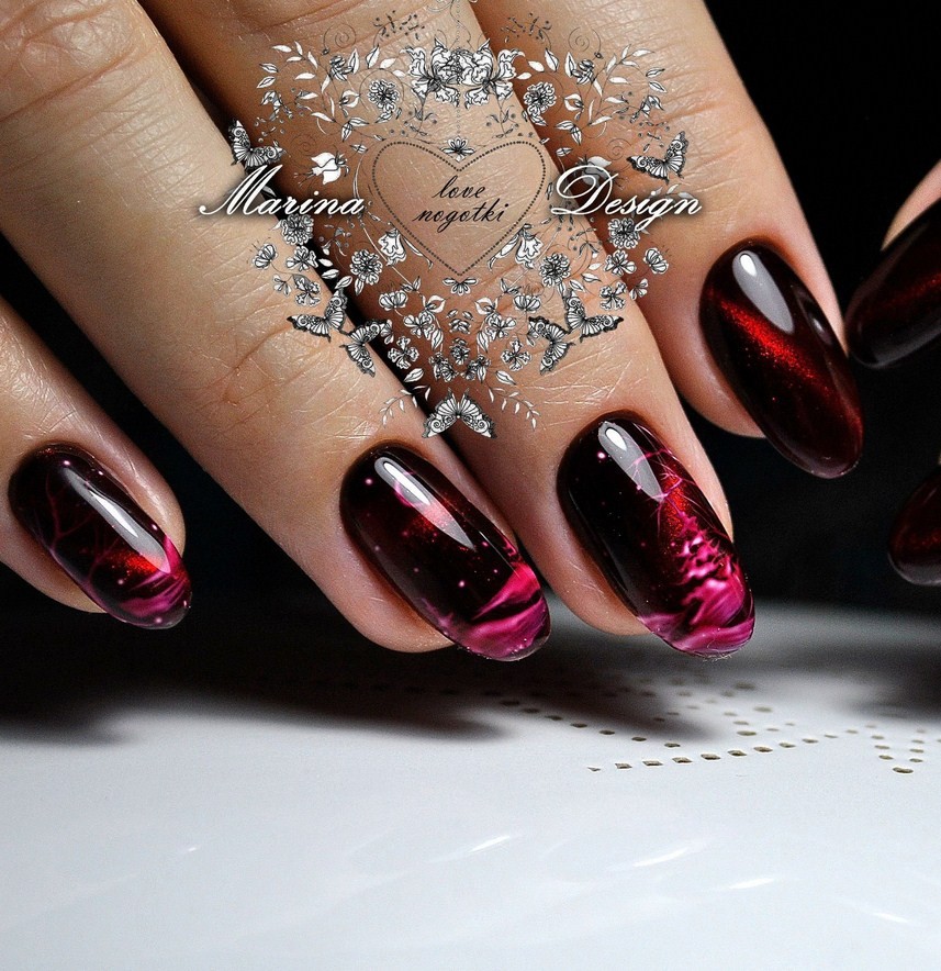 Краска с магнитным покрытием в виде перелива, напоминающая камень кошачий глаз, уже много лет в тренде. Переливы в сочетании с бордовым гелем делают дизайн загадочным и загадочным.