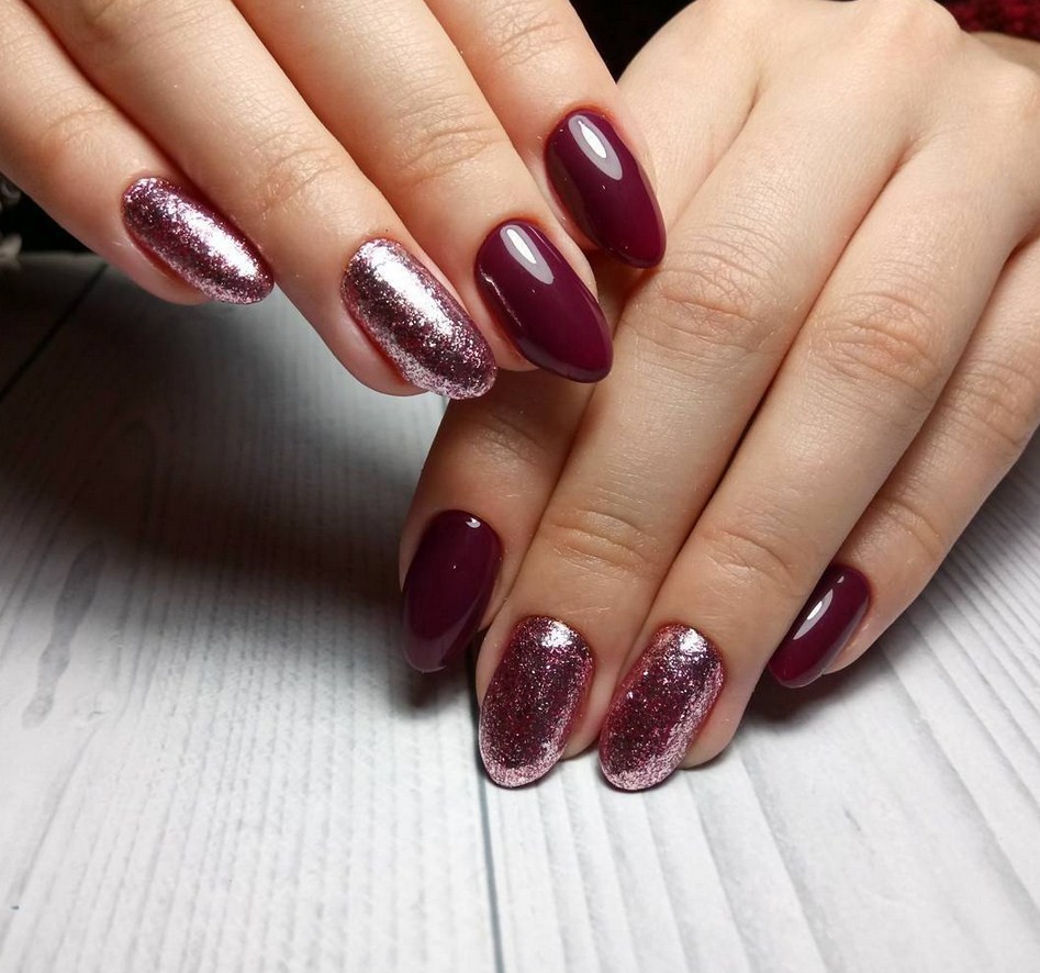 Блестки, находящиеся в составе лака, могут быть либо крупными, либо в виде пылинок. Золотом можно окрасить только один ноготь, а остальные оставить в бордовом цвете.