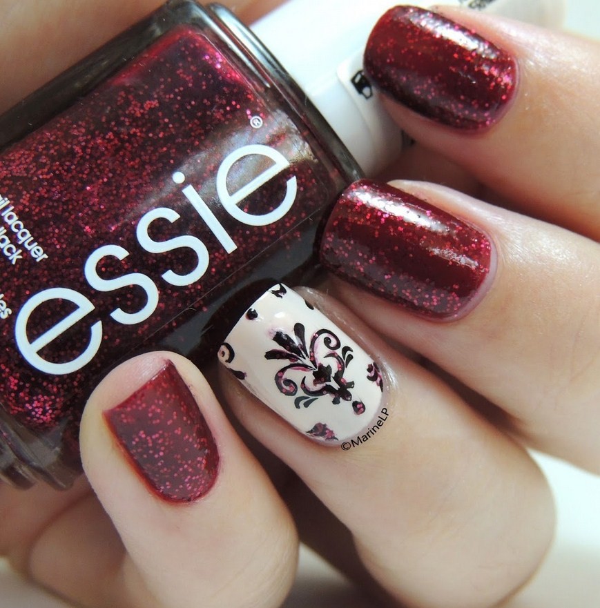 С роскошным цветом, как темно-красный, есть масса способов сделать дизайн уникальным и привлекающим внимание. Такой маникюр часто выбирают деловые женщины, ведь он гармонично смотрится с офисным стилем в одежде. Дизайн создается при помощи специальных инструментов: тонкая кисть, фольга, слюда, трафареты и, конечно же, лаки