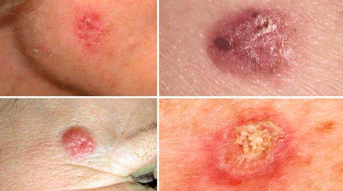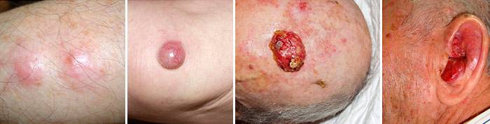 Начальная стадия базальноклеточного рака выглядит как узел, возвышающийся над поверхностью кожи. Со временем на его поверхности образуется язвочка, покрытая корками. Если ее удалить, обнаруживается дно язвы, покрытое бугорками красно-коричневого цвета.