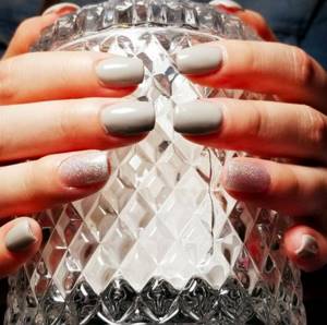 Светло-серый пастельный или лак оттенка taupe – на пике популярности. Такой маникюр, с одной стороны, не будет выглядеть слишком мрачно, с другой – будет сочетаться с любым нарядом и точно не вызовет вопросов ни у преподавателей в институте, ни у руководства на работе. А если хотите сделать его интереснее, несколько ногтей накрасьте лаком с глиттером или шиммером.