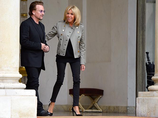 Встречи с представителями различных политических партий и взглядов продолжались. Почти сразу же после знакомства с миссис Трамп Брижит встречается с солистом легендарной группы U2. И демонстрирует еще один удивительный образ, хотя на этот раз без мини.