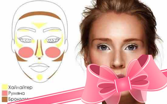 Главная цель макияжа – скрыть недостатки и подчеркнуть преимущества, максимально приблизив лицо к общепринятым представлениям о красоте. Ниже представлена схема применения бронзатора и хайлайтера, которую следует использовать для пошагового нанесения, выбрав свою форму лица.