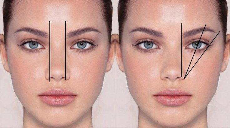 - Начало брови – это линия, проведённая вертикально через край ноздри.