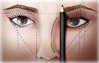 - Конец брови определит линия, проведённая через основание носа к уголку внешней стороны глаза.