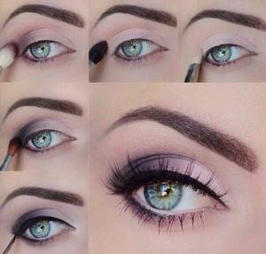 - Оформление верхнего века сводится к тому, что внутренний уголок глаза красят бледно-розовыми тенями, а внешний нежно-сиреневым цветом с перламутром. Растушевываем оттенки, чтобы не было заметно переходов из цвета в цвет. Оформляем веко черной подводкой.