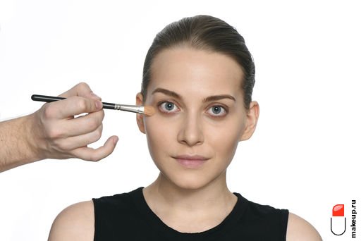 Серыми тенями проводим линию под бровями. Таким же цветом подводим нижнее веко;