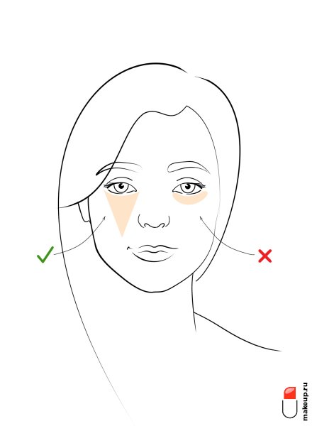 Под глаза консилер следует наносить по форме перевернутого треугольника, как показано на схеме ниже.