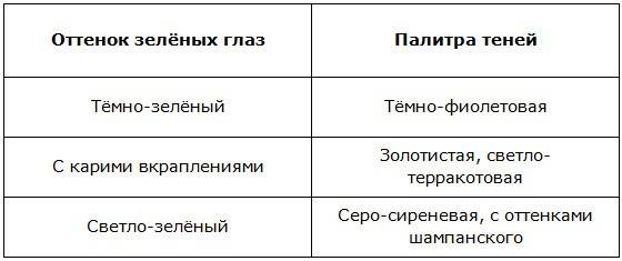 Что касается теней под оттенок зелёных глаз, можно взять на вооружение следующие данные: