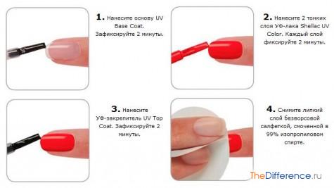 Главное отличие шеллака от обычного лака – после каждого слоя ноготь просушивают в течение минуты под ультрафиолетовой (в некоторых случаях LED-) лампой. Полимеризуется и закрепляется покрытие исключительно после воздействия лучей.