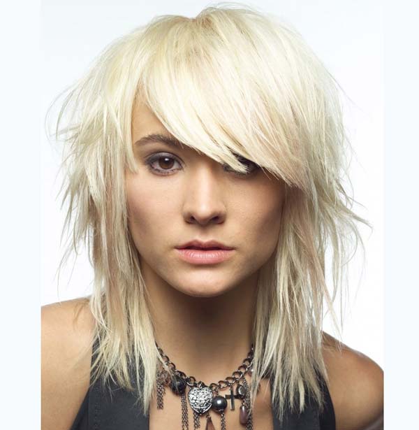 Начало лесенки здесь очень высоко, так как оно находится на уровне подбородка и ниспадает до плеч. Благодаря глубокому неровному пробору укладка приобретает интересную асимметричную нотку.